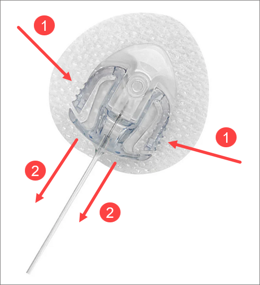 - Placera infusionssetet mot kroppen och se till så slangen ligger i den skåran dit pilen pekar. Detta är alltid den skåran som är närmst när slangen börjar. Tänk även på att slangens bör peka ut från kroppen: