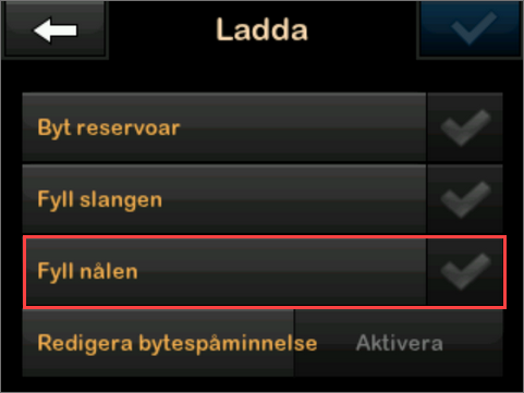 - Tryck på sista steget i pumpens egna checklista vilket är "Fyll nål".