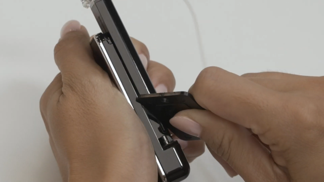 - Du kommer höra att det klickar till. Detta är när den fastnar i laddat länge. Var försiktig med infusionssetet så du inte råkar skjuta av det. Håll enbart i de räfflade ytorna enligt tidigare bild så länge du inte är redo att skjuta av.