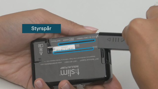 - Sätt i den nya fyllda reservoaren. Det gör inget om den nya slangen inte är kopplad ännu då slangen tillhör infusionssetet, vilket kommer i ett senare steg. Den nya reservoaren skall skjutas in i nedan spår:
