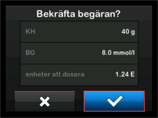 - När du kommit till steget att bekräfta bolus-begäran välj godkänn med blå bock: