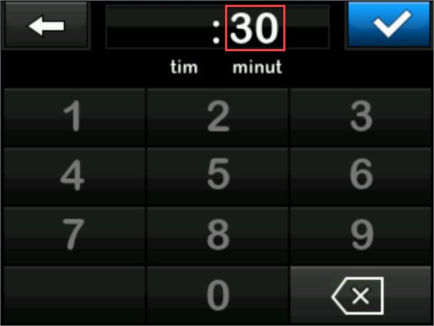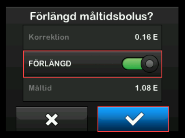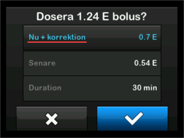 30 minuter innebär att 50% kommer ges nu och resterande 50% kommer ges om 30 minuter. Detta är användningsbart om du t.ex. inte skulle orka äta upp. Då har du inom 30 minuter valet att avbryta din förlängda bolus. - Du får nu en ny sammanställning där det framgår att din förlängda bolus gäller 30 minuter. Tryck på blå bock: