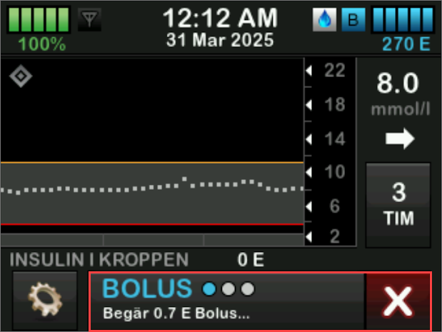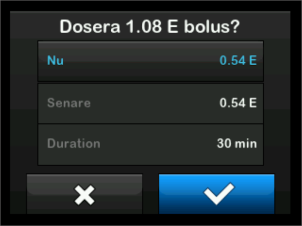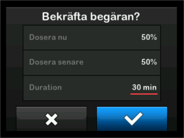 - Kontrollera så allt blev rätt. Notera hur din förlänga bolus gäller 30 minuter. Bekräfta begäran genom att tryck på blå bock: