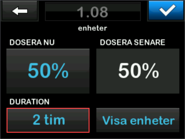 Notera att det bara står 1.08 enheter, detta då det enbart gäller en förlängning av måltidsbolusen. Man kan även ändra 50/50% till andra värden beroende på om man hade tänkt äta snabba kolhydrater nu och långsamma senare in på måltiden. Börja med 50/50% och se hur det går om du inte har någon specifik preferens på ordning av matintaget. - Nu kommer du få välja hur lång förlängningen kommer vara. Har du aldrig gjort detta innan, börja smått, speciellt om du har små barn som har mycket små enheter. Hur lång durationen skall vara beror helt på vad du äter och hur din kropp reagerar. Börja med 20 minuter (minsta duration). Diabetesmottagningen Barn har rekommenderat 30 minuter, därför använder vi detta i nedan exempel: