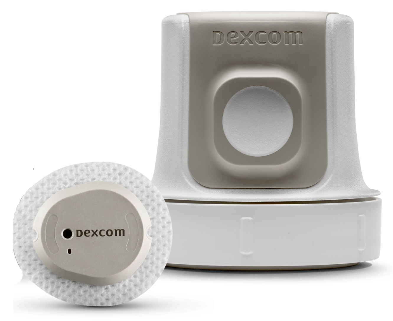 Dexcom G7 är en kontinuerlig glukosmätare (CGM) som mäter Charlies blodsocker var 5:e minut och skickar informationen direkt till hans insulinpump och mobiltelefon. Så här ser sensorn ut: