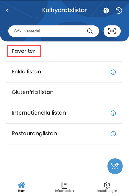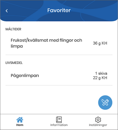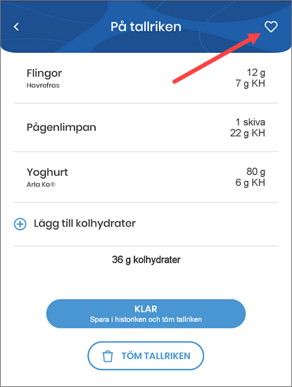 - Här hittar du nu dina favoriter och kan tryck på dem för att lägga till antingen livsmedlet på tallriken eller hela måltiden på tallriken för att se hur många kolhydrater det blir: