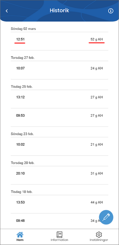 - Här ser du en vy över datum och tid för en händelse som sparades i historiken. Du ser inte vad som fanns på tallriken men man kan enkelt lista ut det baserat på datum/klockslag och hur många kolhydrater tallriken innehöll. I nedan exempel från historiken kan vi anta att detta var lunch: