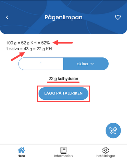 Uträkning som appen redan gjort: 43 x 0,52 = 22 g kolhydrater