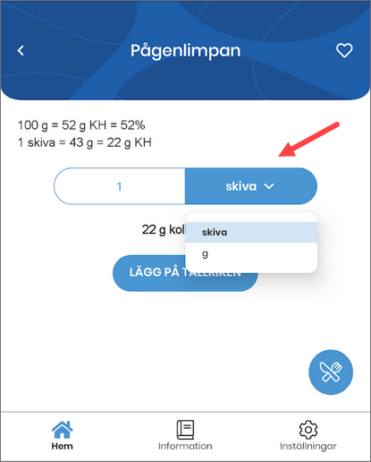 Tänk på att man kan samtidigt trycka på "skiva" för att byta från skriva till gram om man själv vill väga en macka och mata in egna värden i gram. Appen kommer fortfarande göra uträkningen åt sig, bara att du matar in vikten. Tänk bara på att alla livsmedel har inte metoden "skiva" utan vissa har enbart gram och då måste du väga eller göra en uppskattning.