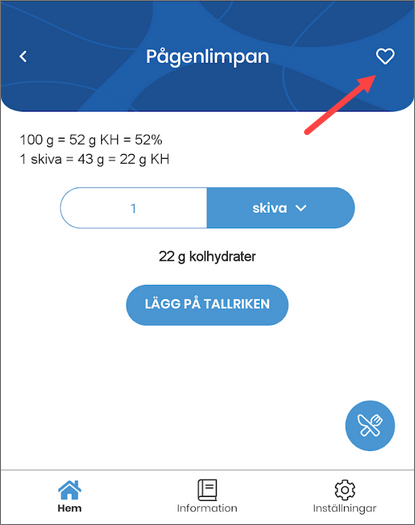 - Sök fram ett livsmedel och tryck på ikonen som ser ut som ett hjärta. Tryck på den: