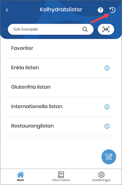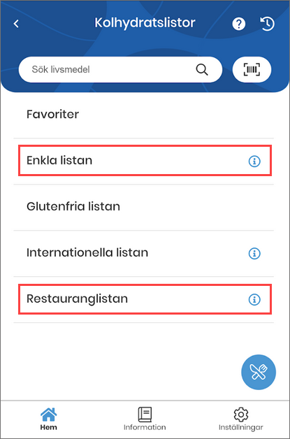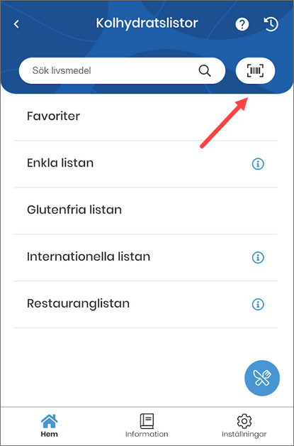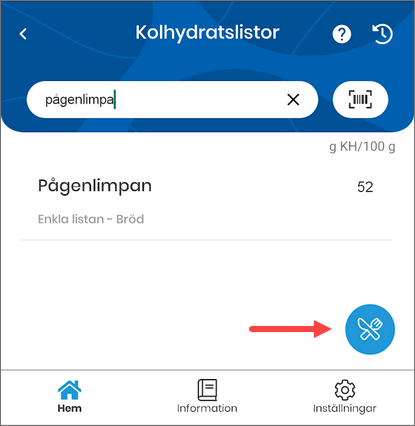 - Öppna appen och tryck på "KOLHYDRATLISTOR".