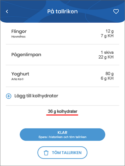 - Glöm inte att trycka på [KLAR] vilket kommer spara måltiden i historiken och tömma tallriken samtidigt. Se nedan för mer information om historiken. Alternativt tryck på [TÖM TALLRIK] för att tömma tallriken men inte spara i historiken. Detta är viktigt för att vid nästa användning av appen kommer den komma ihåg vad som låg på tallriken då. Vilket gör att man lätt kan få för många kolhydrater på en tallrik och därmed dosera fel vid en Bolus.