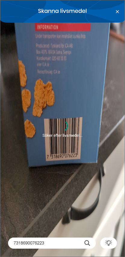 - Skanna streckkoden på ett livsmedel varpå appen kommer söka upp rätt livsmedel åt dig: