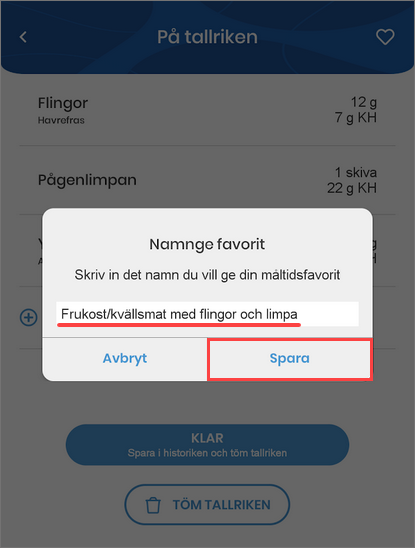 - Namnge din måltid till något passande och tryck på [Spara]: